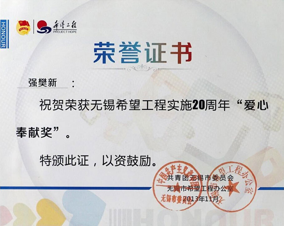 2013.11 無錫希望工程實(shí)施20周年愛心奉獻(xiàn)獎(jiǎng)