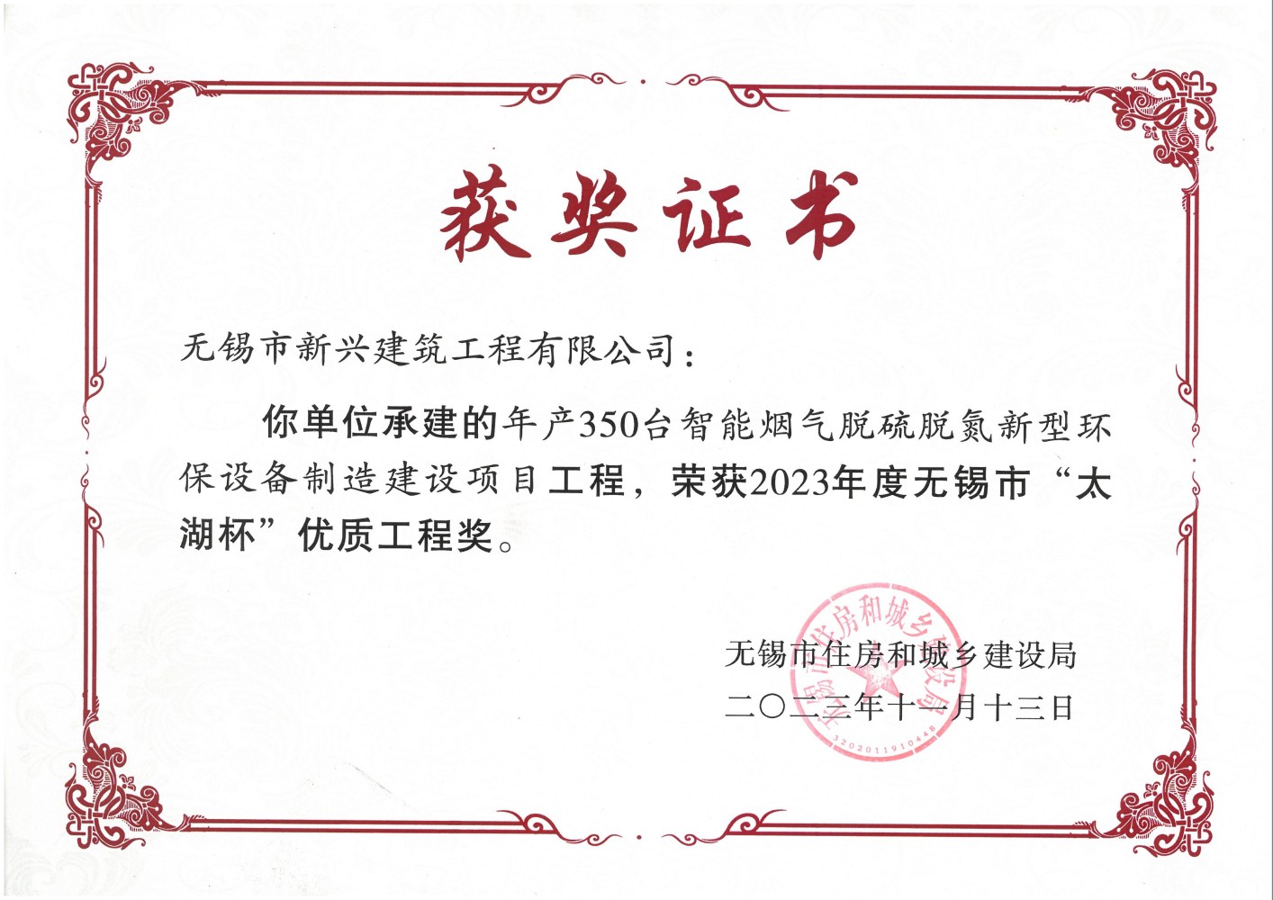 2023.11 新興建筑公司智能煙氣工程2023年度無錫市太湖杯優(yōu)質工程獎